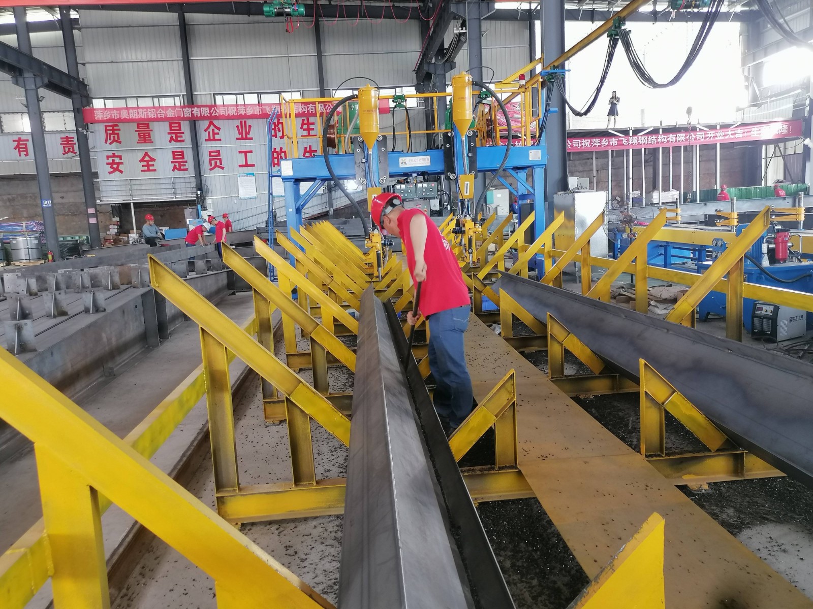 擁有大型鋼結(jié)構(gòu)生產(chǎn)線,其中包括自動(dòng)數(shù)控火焰切割機(jī),自動(dòng)數(shù)控鉆孔機(jī),組立機(jī),大型龍門埋弧焊機(jī),翼緣板矯正機(jī),并擁有多臺(tái)二氧化碳?xì)怏w保護(hù)焊機(jī),年生產(chǎn)能力可達(dá)9000噸。